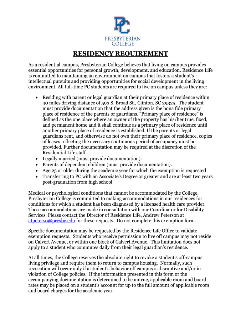 RESIDENCY REQUIREMENT As a residential campus, Presbyterian College believes that living on campus provides essential opportunities for personal growth, development, and education. Residence Life