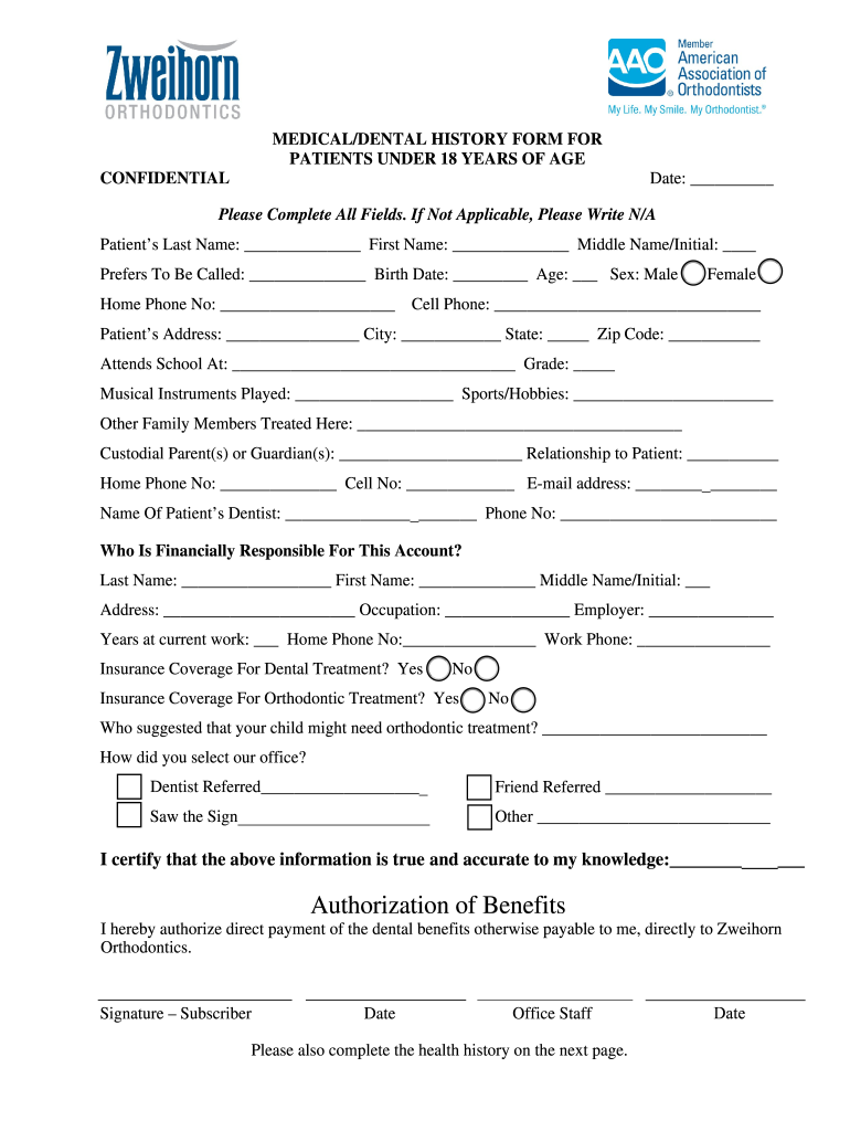 MEDICAL/DENTAL HISTORY FORM FOR PATIENTS UNDER 18 YEARS OF AGE Confidentiality: Please Complete All Fields. If Not Applicable, Please Write N/A Patients Last Name: First Name: Middle Name/Initial: