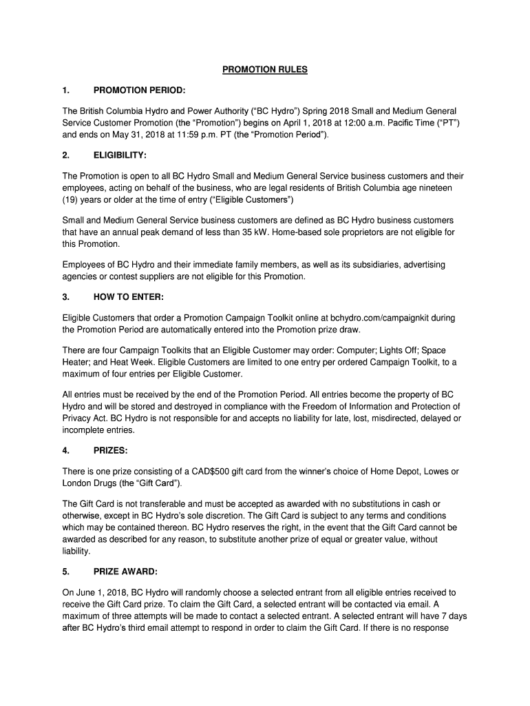 1.PROMOTION PERIOD:The British Columbia Hydro and Power Authority (BC Hydro) Spring 2018 Small and Medium General