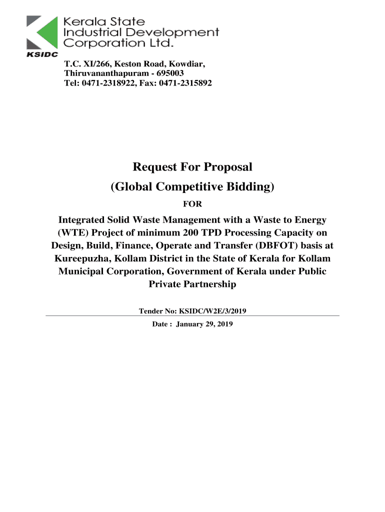 T.C. XI/266, Weston Road, Kodiak, Thiruvananthapuram 695003 Tel: 04712318922, Fax: 04712315892Request For Proposal (Global Competitive Bidding) Integrated Solid Waste Management with a Waste to Energy