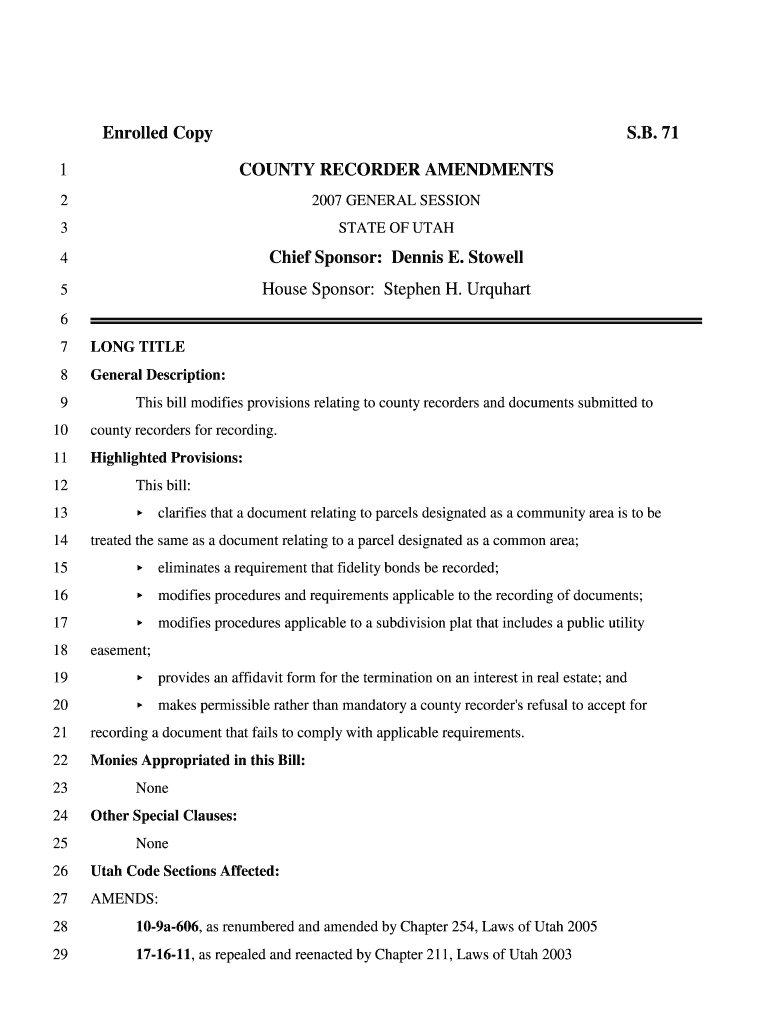 Enrolled Copy. B. 711COUNTY RECORDER AMENDMENTS22007 GENERAL SESSION3STATE OF UTAH4Chief Sponsor: Dennis E. Stowell5House Sponsor: Stephen H. Urquhart6
