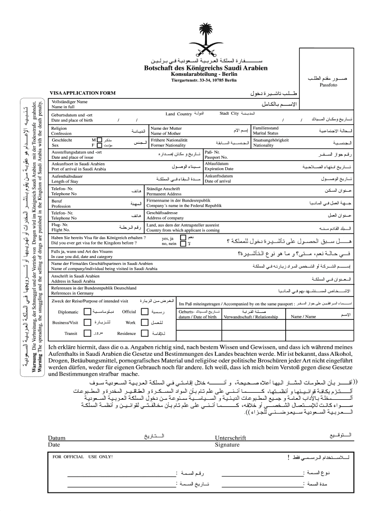 Das VISA ANTRAGBORMULAR ist ein Dokument, das von Antragstellern verwendet wird, um ein Visum für Saudi-Arabien zu beantragen.