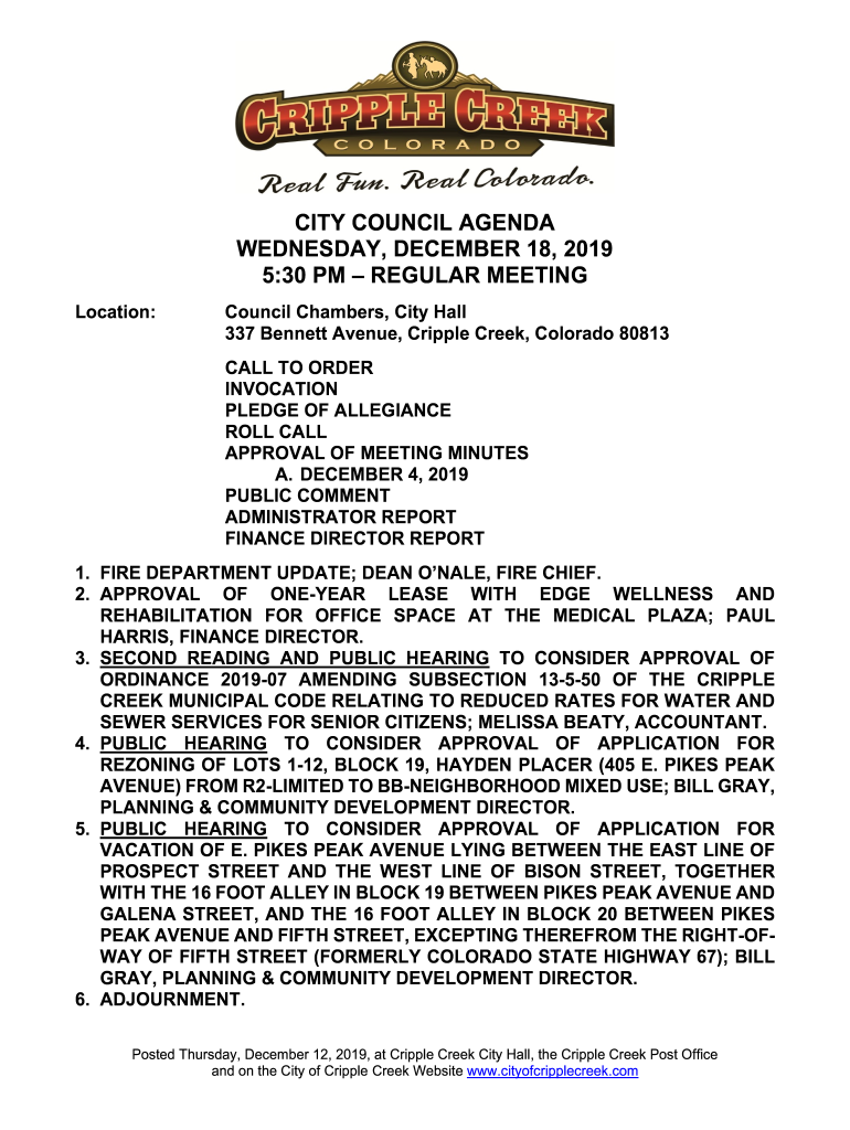 CITY COUNCIL AGENDA WEDNESDAY, DECEMBER 18, 2019 5:30 PM REGULAR MEETING Location:Council Chambers, City Hall 337 Bennett Avenue, Cripple Creek, Colorado 80813 CALL TO ORDER INVOCATION PLEDGE OF ALLEGIANCE