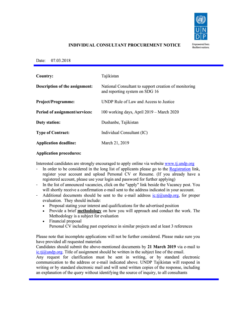 INDIVIDUAL CONSULTANT PROCUREMENT NOTICE Date:07.03.2018Country:TajikistanDescription of the assignment:National Consultant to support creation of monitoring and reporting system on SDG 16Project/Program:UNDP
