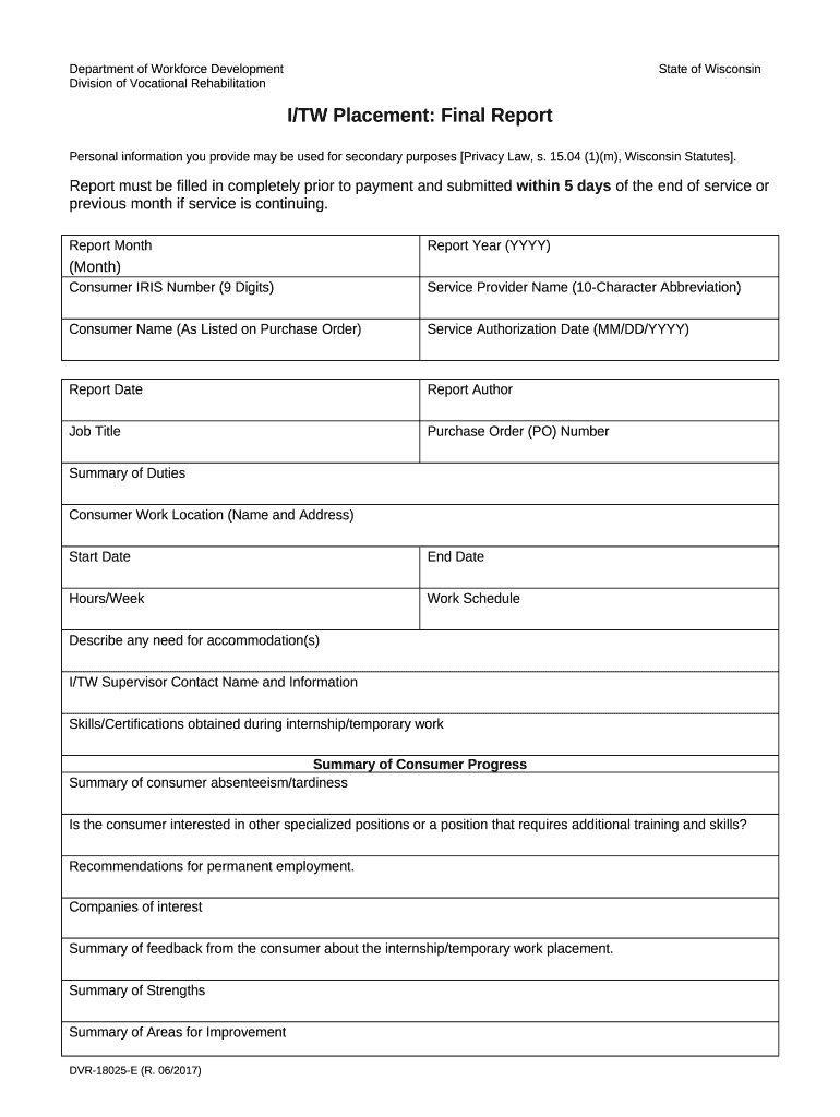 DVR-18025-E, Internship/Temporary Work (I/TW) Placement (Final Report). This is to be completed by DVR Service Providers to report on internship/temporary work (I/TW) placement final report authorized by DVR. word template: frequently asked questions