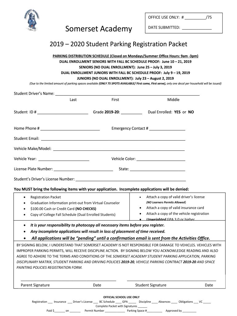 OFFICE USE ONLY: # /75Somerset AcademyDATE SUBMITTED: 2019 2020 Student Parking Registration Packet PARKING DISTRIBUTION SCHEDULE (Closed on Mondays/Summer Office Hours: 9am 3pm) DUAL ENROLLMENT SENIORS