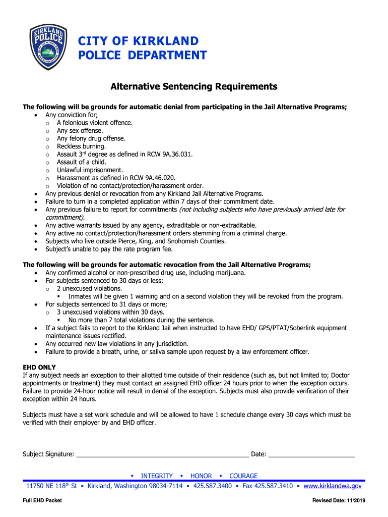 CITY OF KIRKLAND POLICE DEPARTMENT Alternative Sentencing Requirements The following will be grounds for automatic denial from participating in the Jail Alternative Programs; Any conviction for; o
