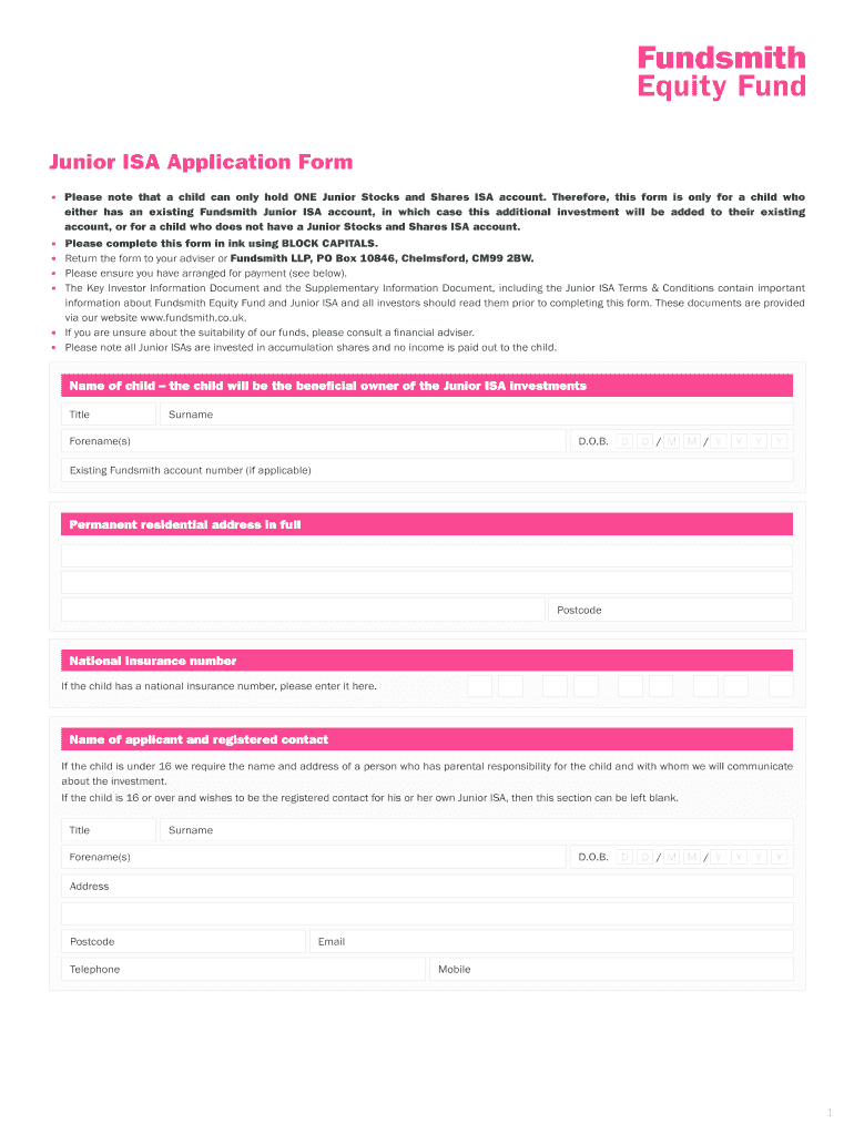 Junior ISA Application Form Please note that a child can only hold ONE Junior Stocks and Shares ISA account. Therefore, this form is only for a child who either has an existing Fund smith Junior ISA