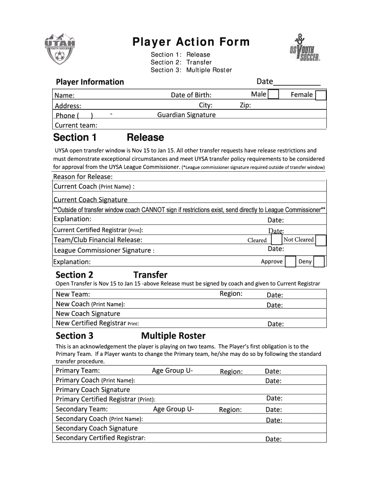 The Player Action Form is a document used by individuals involved in youth soccer to manage player transfers, releases, and multiple roster acknowledgments.