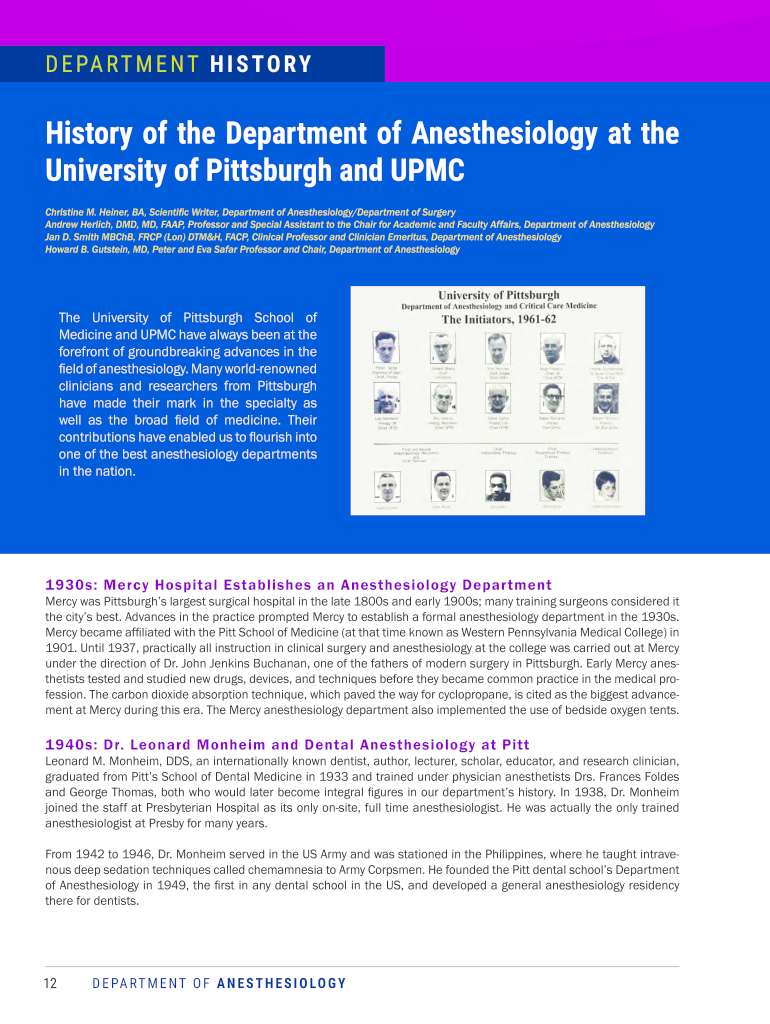 D E PA R T M E N T H I S T O RY History of the Department of Anesthesiology at the University of Pittsburgh and UPMC Christine M. Heiner, BA, Scientific Writer, Department of Anesthesiology/Department