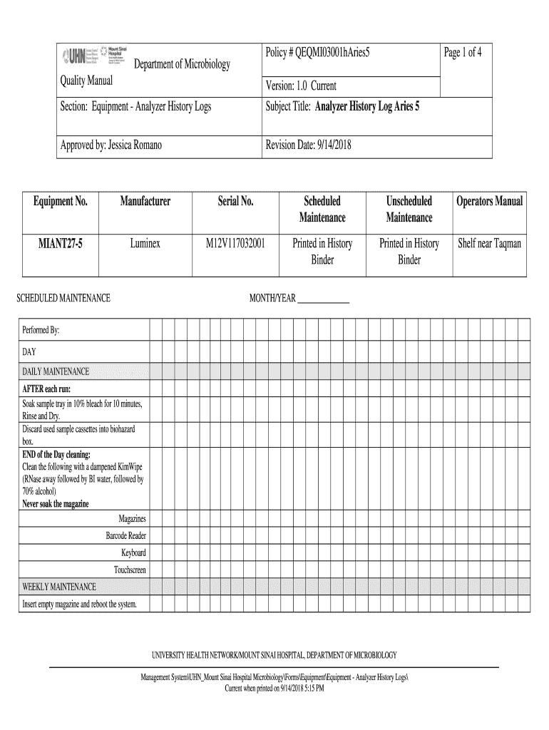 Policy # QEQMI03001hAries5Department of Microbiology Quality Manual Page 1 of 4Section: Equipment Analyzer History Conversion: 1.0 Current Subject Title: Analyzer History Log Aries 5Approved by: Jessica