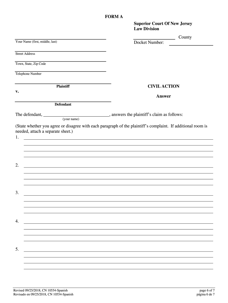 Civil Each Contestation Actualized en September de 2018Cmo presenter RNA contestation an RNA demand en El Tribunal Superior de Nueva Jersey Division de Derecho Part Civil How to File an Answer to
