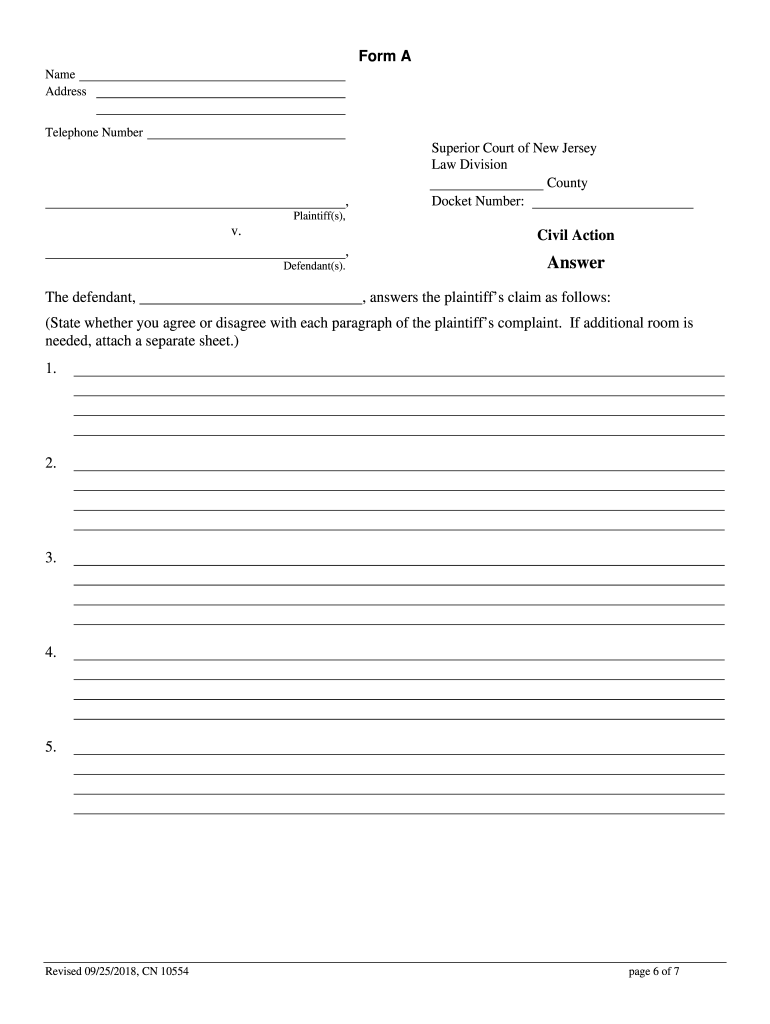 Civil Law Answer Updated September 2018How to File an Answer to a Complaint in the Superior Court of New Jersey Law Division Civil Part Who Should Use This Packet? You may use this package if you