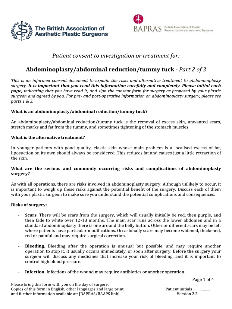 Patient consent to investigation or treatment for: Acromioplasty/abdominal reduction/tummy tuck Part 2 of 3 This is an informed consent document to explain the risks and alternative treatment to acromioplasty