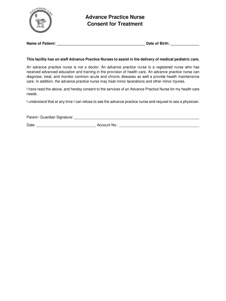 Advance Practice Nurse Consent for TreatmentName of Patient: Date of Birth: This facility has on staff Advance Practice Nurses to assist in the delivery of medical pediatric care. An advance practice