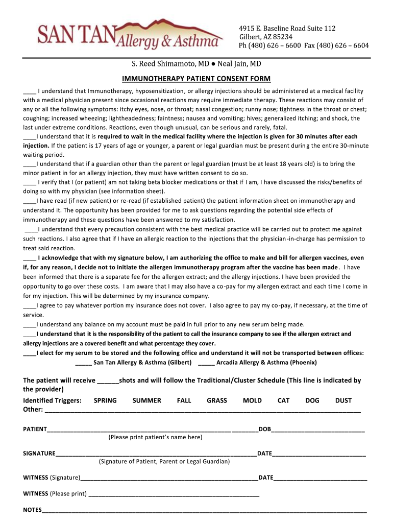 4915 E. Baseline Road Suite 112 Gilbert, AZ 85234 pH (480) 626 6600 Fax (480) 626 6604S. Reed Minamoto, MD Neal Jain, MD IMMUNOTHERAPY PATIENT CONSENT FORM I understand that Immunotherapy, hyposensitization,