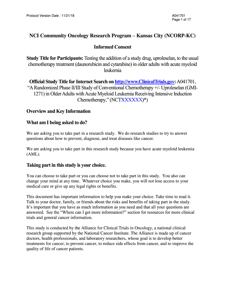 Protocol Version Date : 11/21/18A041701 Page 1 of 17NCI Community Oncology Research Program Kansas City (CORPS) Informed Consent Study Title for Participants: Testing the addition of a study drug,