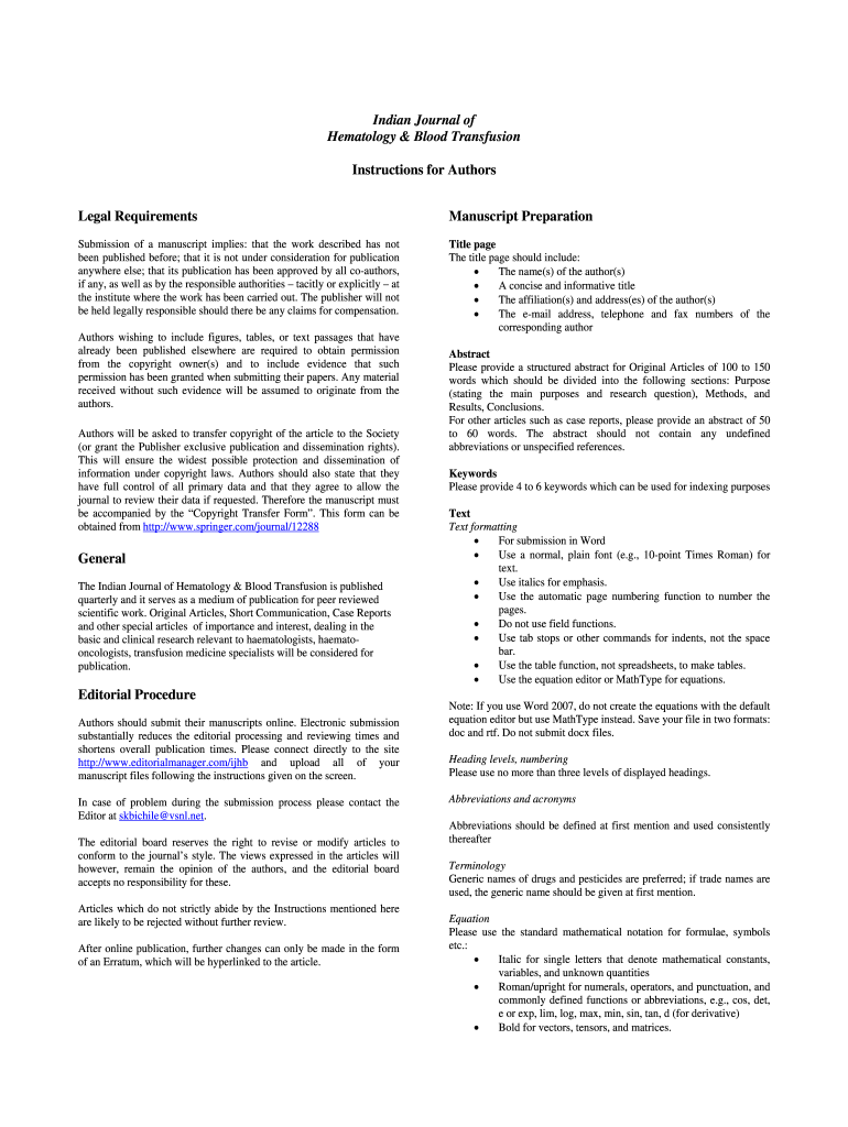 Indian Journal of Hematology & Blood Transfusion Instructions for Authors Legal RequirementsManuscript PreparationSubmission of a manuscript implies: that the work described has not been published