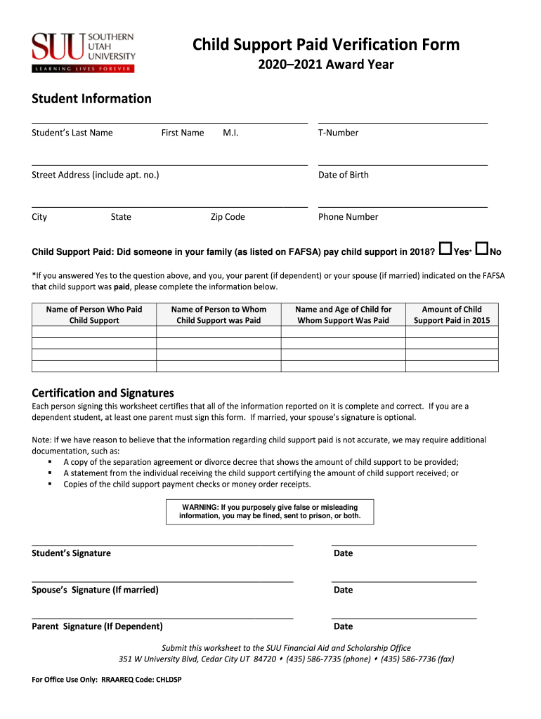 Child Support Paid Verification Form 20202021 Award Year Student Information Students Last Name First Name M.I. Number Street Address (include apt. No.) Date of Birth City State Zip Code Phone NumberChild