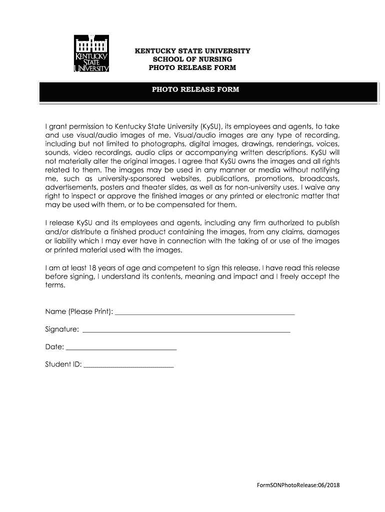 Get the free KENTUCKY STATE UNIVERSITY SCHOOL OF NURSING PHOTO RELEASE FORM