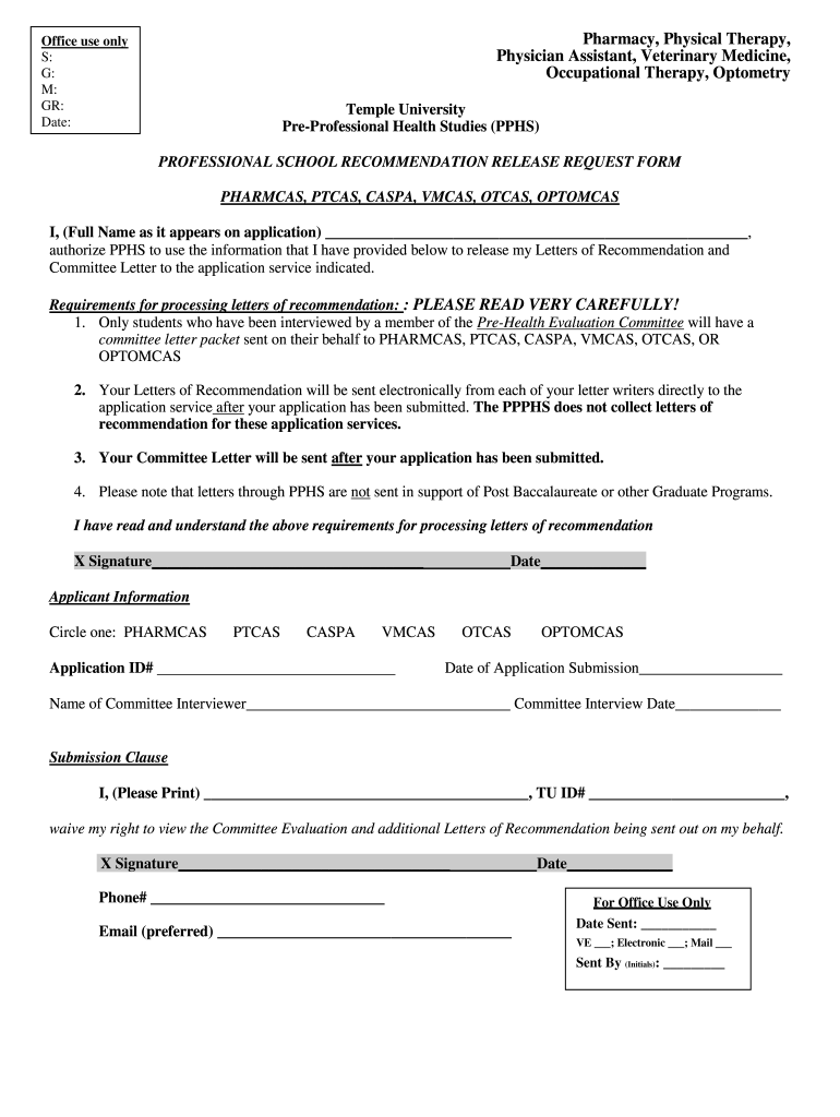 Pharmacy, Physical Therapy, Physician Assistant, Veterinary Medicine, Occupational Therapy, OptometryOffice use only S: G: M: GR: Date:Temple University PreProfessional Health Studies (PHS) PROFESSIONAL