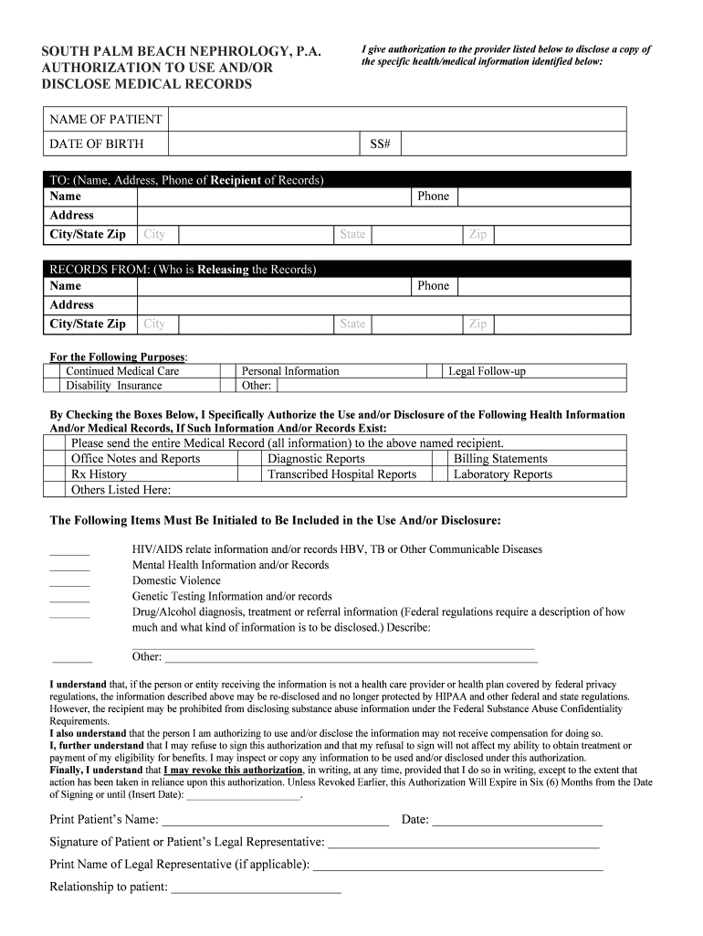 the specific health/medical information identified below:SOUTH PALM BEACH NEPHROLOGY, P.A.