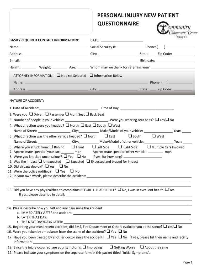 Get the free PERSONAL INJURY NEW PATIENT QUESTIONNAIRE