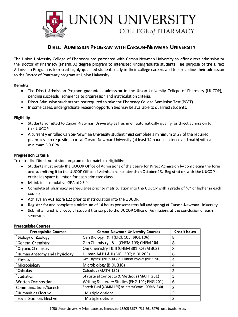 DIRECT ADMISSION PROGRAM WITH CARSONNEWMAN UNIVERSITY The Union University College of Pharmacy has partnered with Carson Newman University to offer direct admission to the Doctor of Pharmacy (Harm.
