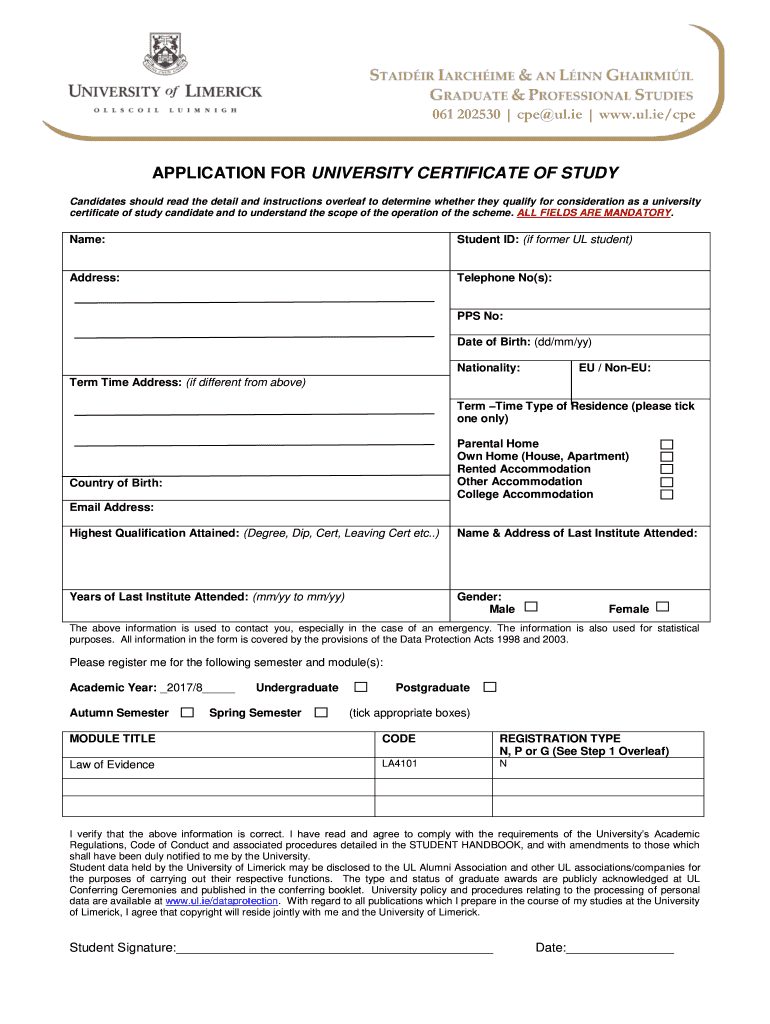 061 202530 CPE UL.i.e. www.ul.ie/cpeAPPLICATION FOR UNIVERSITY CERTIFICATE OF STUDY Candidates should read the detail and instructions overleaf to determine whether they qualify for consideration