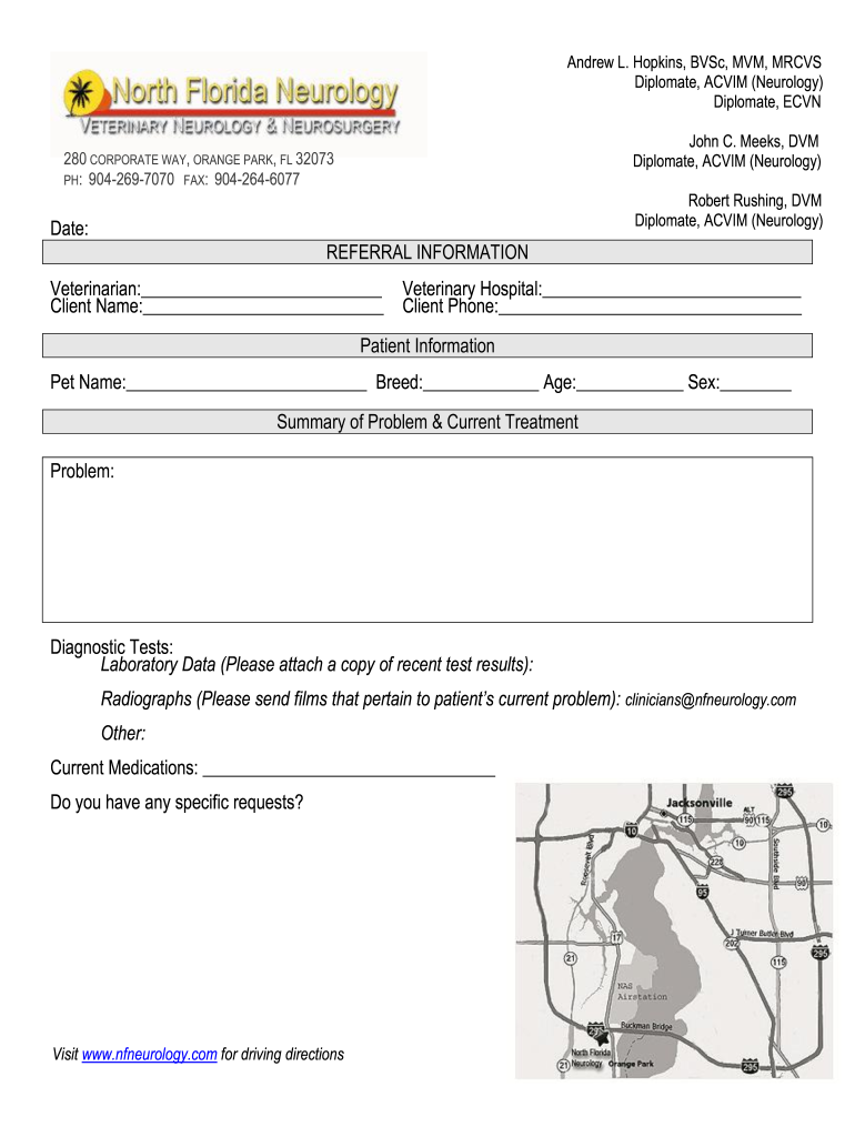 Andrew L. Hopkins, BSC, MM, MR CVS Diplomat, ACHIM (Neurology) Diplomat, ECON John C. Meek's, DVM Diplomat, ACHIM (Neurology)280 CORPORATE WAY, ORANGE PARK, FL 32073 PH: 9042697070 FAX: 9042646077Robert