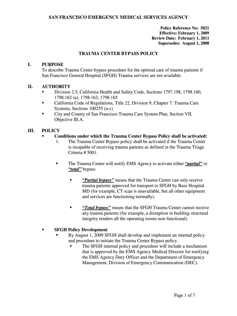 SAN FRANCISCO EMERGENCY MEDICAL SERVICES AGENCY Policy Reference No: 5021 Effective: February 1, 2009, Review Date: February 1, 2011, Supersedes: August 1, 2008TRAUMA CENTER BYPASS POLICY I.PURPOSE