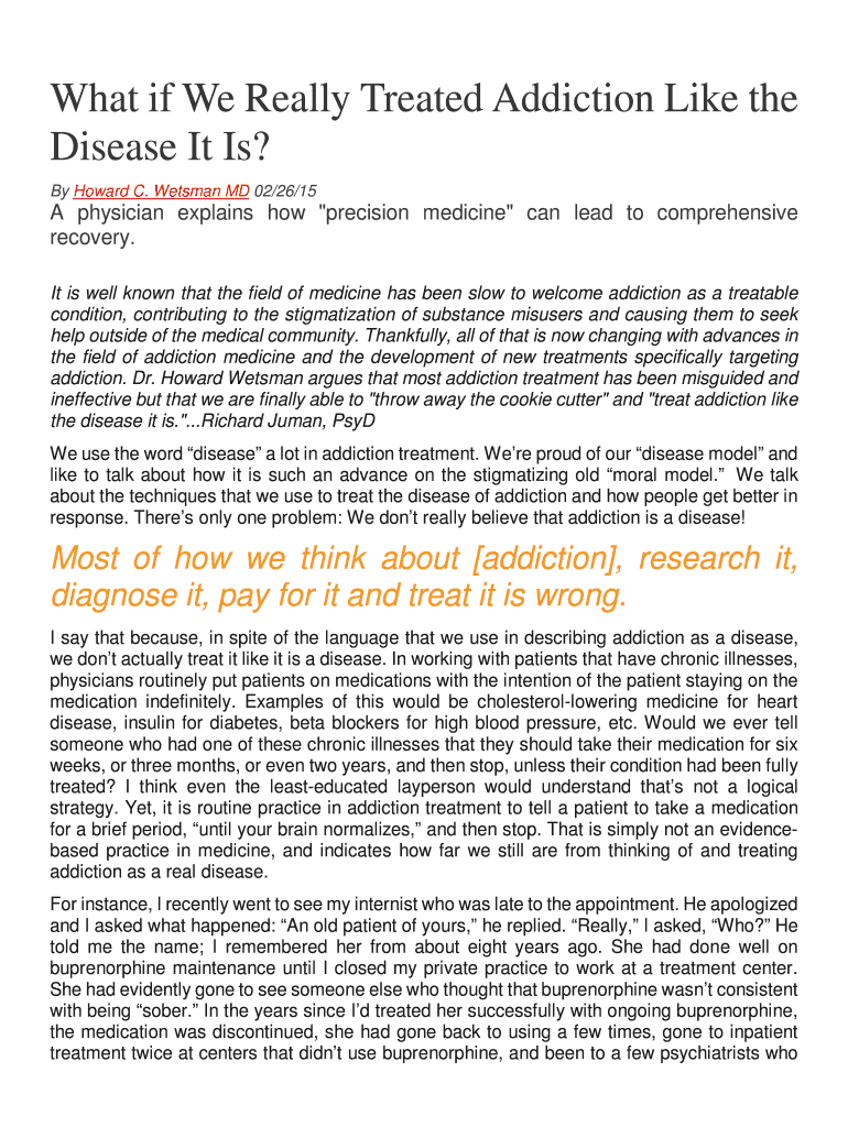 What if We Really Treated Addiction Like the Disease It Is? By Howard C. Wets man MD 02/26/15A physician explains how “precision medicine can lead to comprehensive recovery. It is well known that