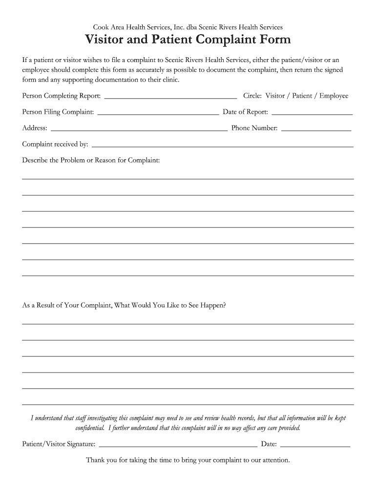 Cook Area Health Services, Inc. DBA Scenic Rivers Health ServicesVisitor and Patient Complaint Form If a patient or visitor wishes to file a complaint to Scenic Rivers Health Services, either the
