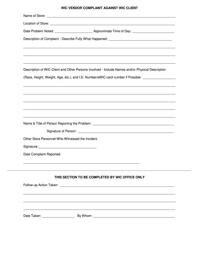 WIC VENDOR COMPLAINT AGAINST WIC CLIENT Name of Store: Location of Store: Date Problem Noted: Approximate Time of Day: Description of Complaint Describe Fully What Happened: Description of WIC Client