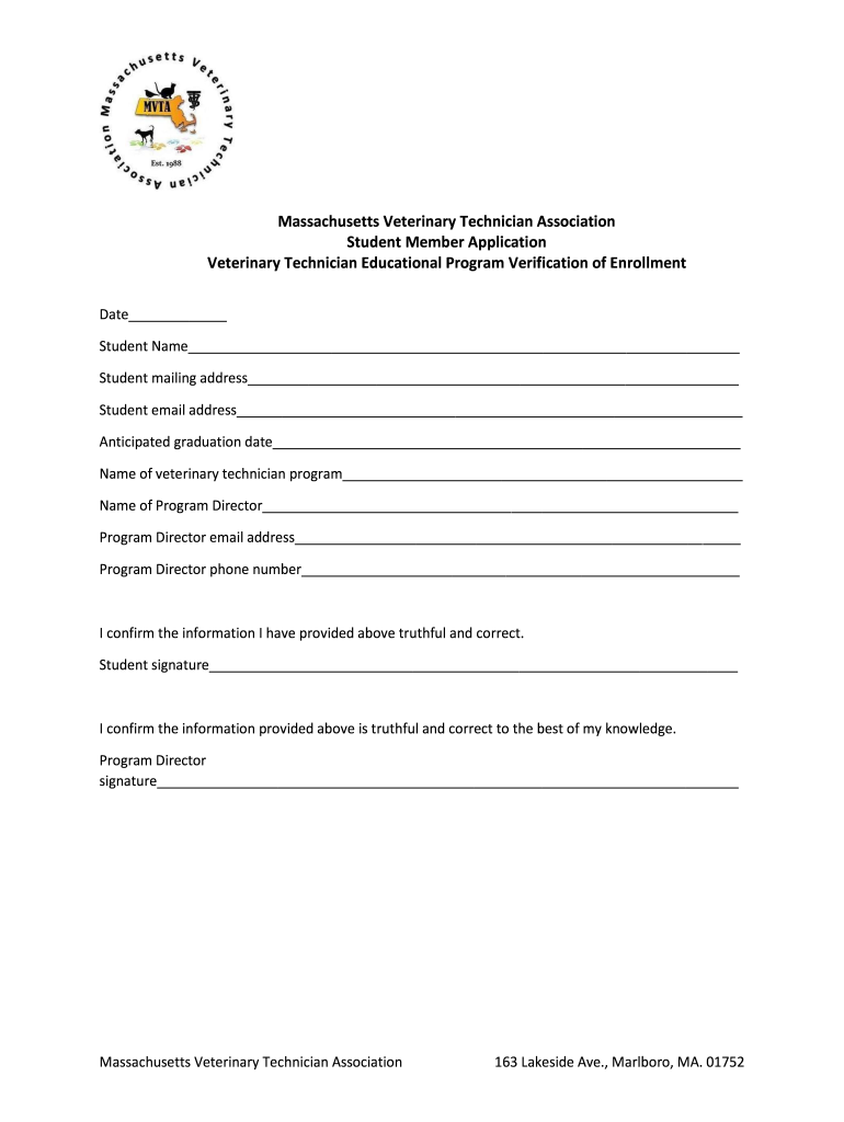 Massachusetts Veterinary Technician Association Student Member Application Veterinary Technician Educational Program Verification of Enrollment Date Student Name Student mailing address Student email