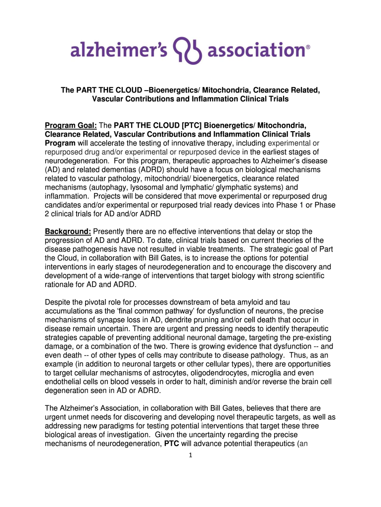 The PART THE CLOUD Bioenergetics/ Mitochondria, Clearance Related, Vascular Contributions and Inflammation Clinical TrialsProgram Goal: The PART THE CLOUD PTC Bioenergetics/ Mitochondria, Clearance