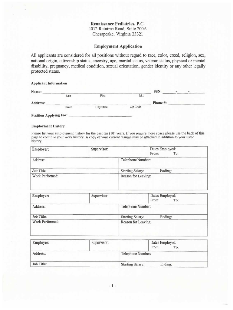 Renaissance Pediatrics, P.C. 4012 Rain tree Road, Suite 200A Chesapeake, Virginia 23321 Employment Application applicants are considered for all positions without regard to race, color, creed, religion,