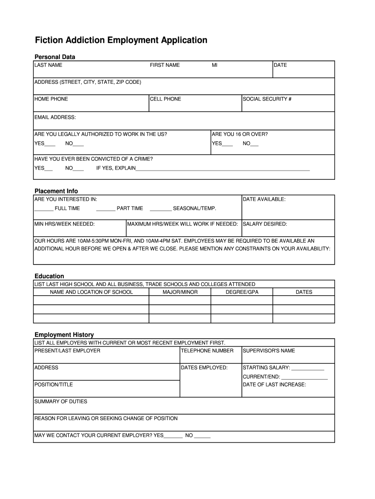 Fiction Addiction Employment Application Personal Data LAST NAMEFIRST NAMEMIDATEADDRESS (STREET, CITY, STATE, ZIP CODE) HOME PHOTOCELL PHONETICIAN SECURITY #EMAIL ADDRESS: ARE YOU LEGALLY AUTHORIZED