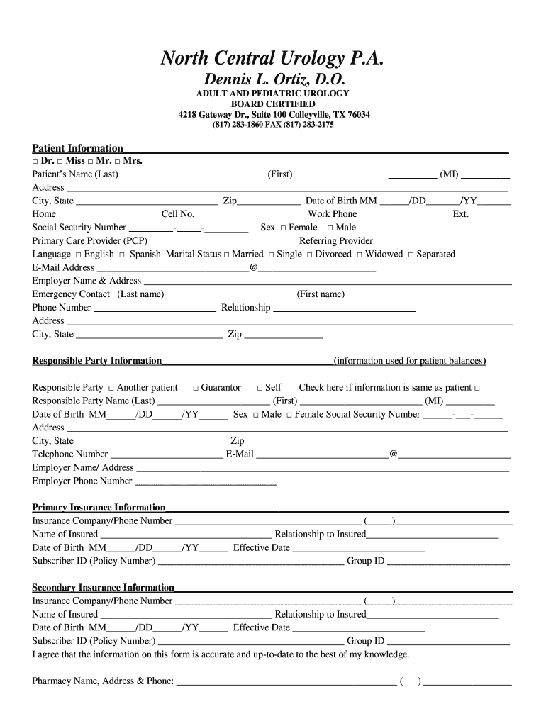 North Central Urology P.A. Dennis L. Ortiz, D.O. ADULT AND PEDIATRIC UROLOGY BOARD CERTIFIED 4218 Gateway Dr., Suite 100 Coffeyville, TX 76034 (817) 2831860 FAX (817) 2832175Patient Information Dr.