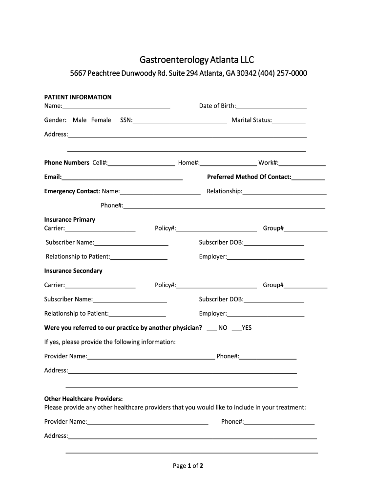 Gastroenterology Atlanta LLC 5667 Peach tree Dunwoody Rd. Suite 294 Atlanta, GA 30342 (404) 2570000 PATIENT INFORMATION Name: Gender: Male Revalidate of Birth: SSN: Marital Status: Address: Phone