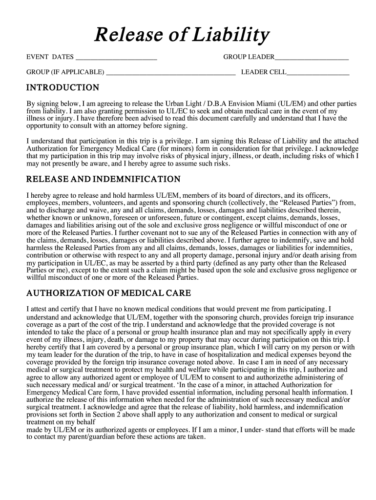 Release of Liability EVENT DATES GROUP LEADER GROUP (IF APPLICABLE) LEADER CELL INTRODUCTION By signing below, I am agreeing to release the Urban Light / D.B.A Envision Miami (UL/EM) and other parties