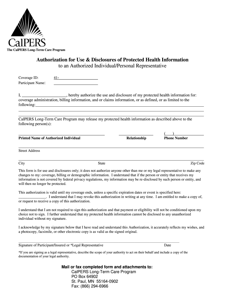 The Callers Longer Care ProgramAuthorization for Use & Disclosures of Protected Health Information to an Authorized Individual/Personal Representative Coverage ID: Participant Name:41I, hereby authorize