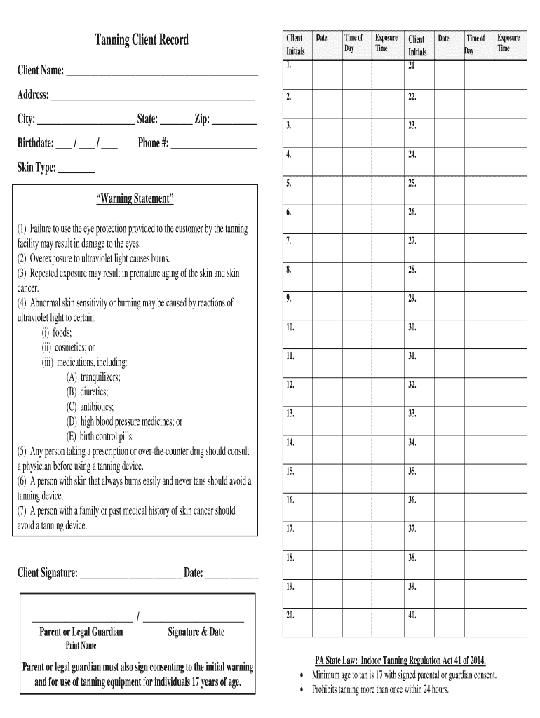 Tanning Client Record Client Name: Client Initials 1. Daytime of Exposure The Timeliest Initials 21Address: 2.22. City: State: Zip: 3.23.4.24.5.25.6.26.7.27.8.28.9.29.10.30.11.31.12.32.13.33.14.34.15.35.16.36.17.37.18.38.19.39.20.40.