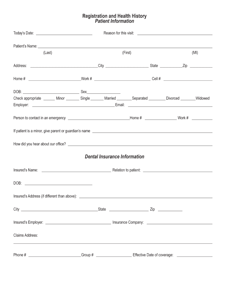 Registration and Health History Patient Information Today's Date: Reason for this visit: Patients Name: (Last)(First)(MI)Address: City State Zip Home # Work # Cell # DOB: Sex Check appropriate Minor