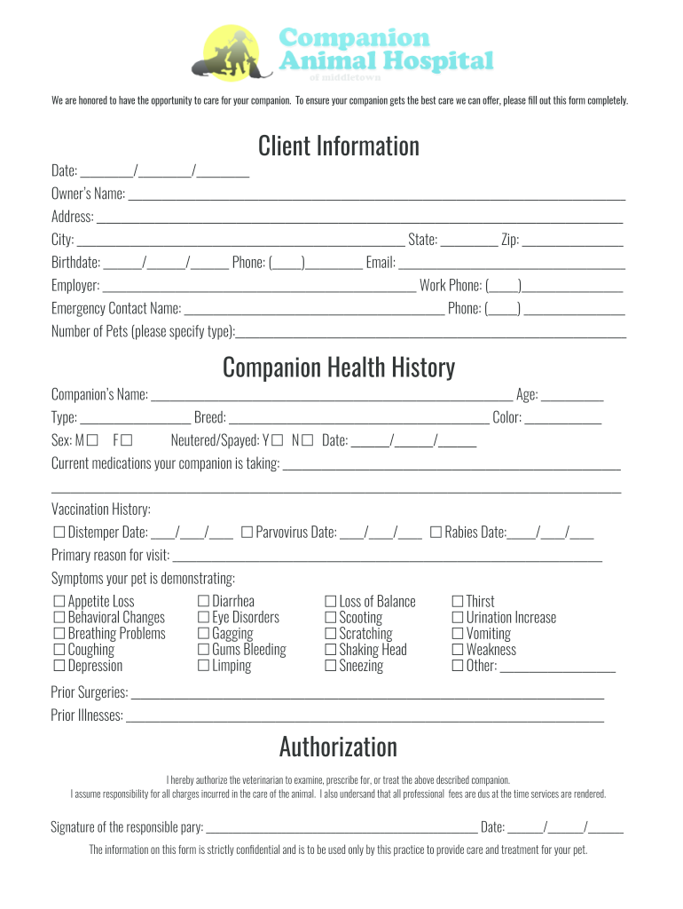 We are honored to have the opportunity to care for your companion. To ensure your companion gets the best care we can offer, please fill out this form completely. Date: / / Client InformationOwners