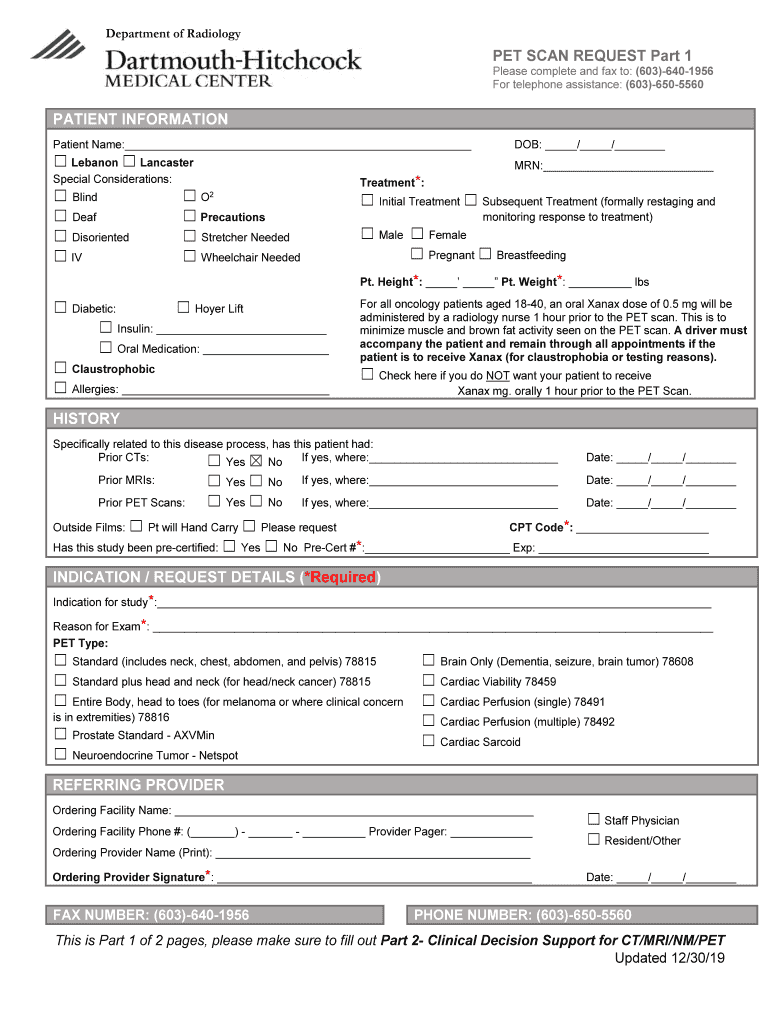 Department of Radiology PET SCAN REQUEST Part 1Please complete and fax to: (603)6401956 For telephone assistance: (603)6505560PATIENT INFORMATION Patient Name: DOB: / / Lebanon Lancaster: Treatment*:Special