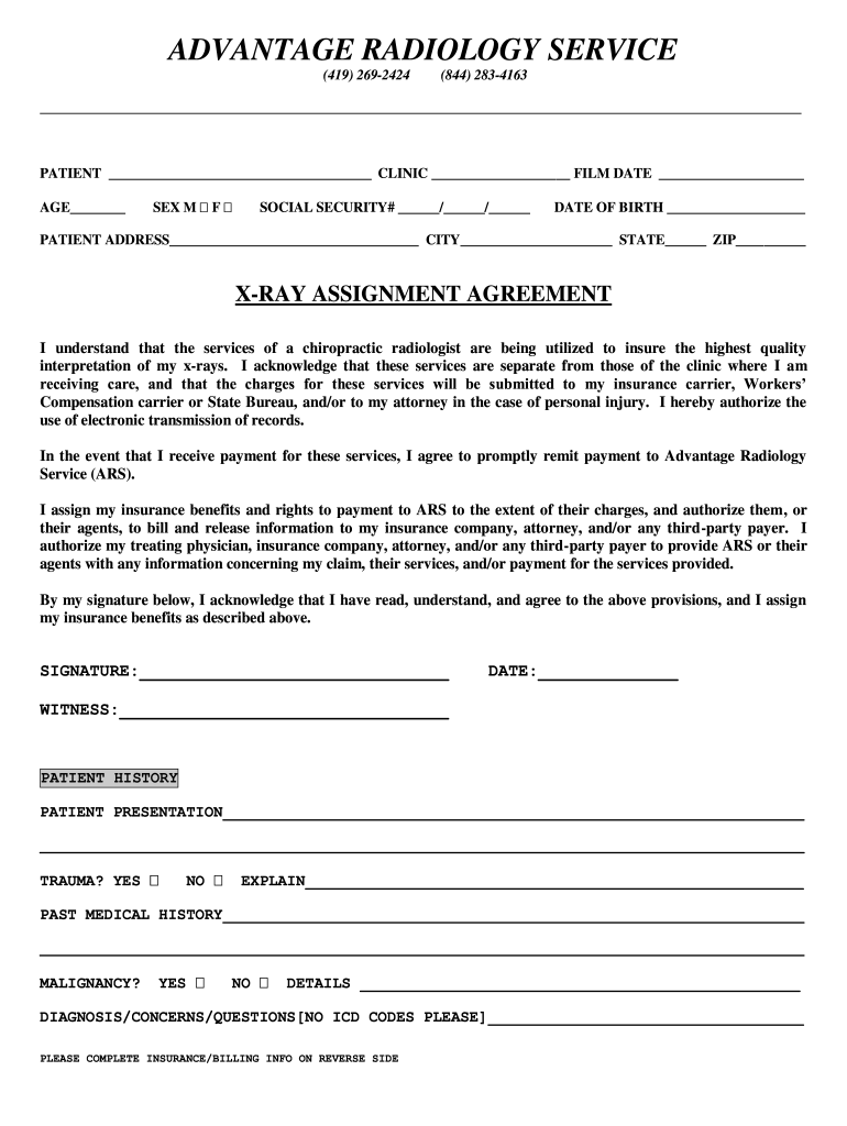 ADVANTAGE RADIOLOGY SERVICE (419) 2692424(844) 2834163 PATIENT CLINIC FILM DATE AGE SEX M F SOCIAL SECURITY# / / DATE OF BIRTH PATIENT ADDRESS CITY STATE ZIP RAY ASSIGNMENT AGREEMENT I understand