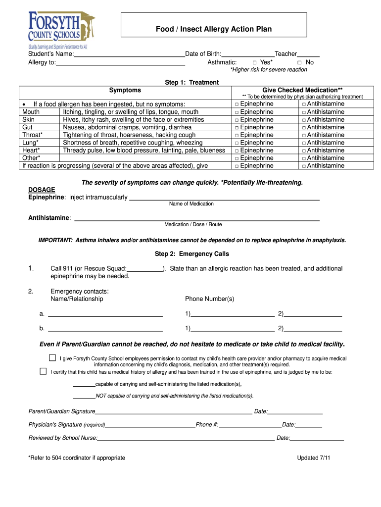 Get the free No Food / Insect Allergy Action Plan - Forsyth County Schools