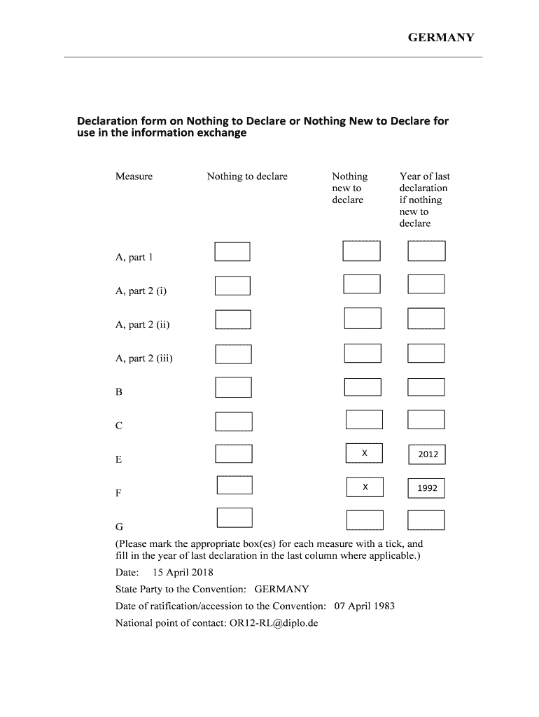 GERMANY Declaration form on Nothing to Declare or Nothing New to Declare for use in the information exchangeMeasureNothing to declareNothing new to declarer of last declaration if nothing new to declared,