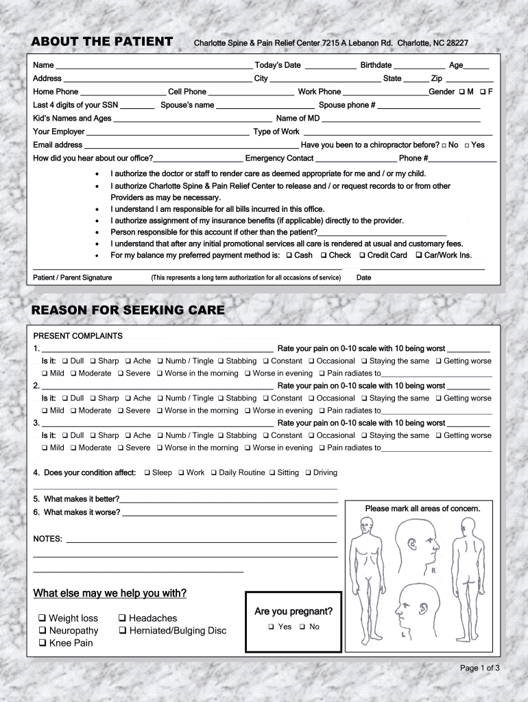 ABOUT THE PATIENT Charlotte Spine & Pain Relief Center 7215 A Lebanon Rd. Charlotte, NC 28227Name Today's Date Birthdate Age Address City State Zip Home Phone Cell Phone Work Phone Gender M F Last